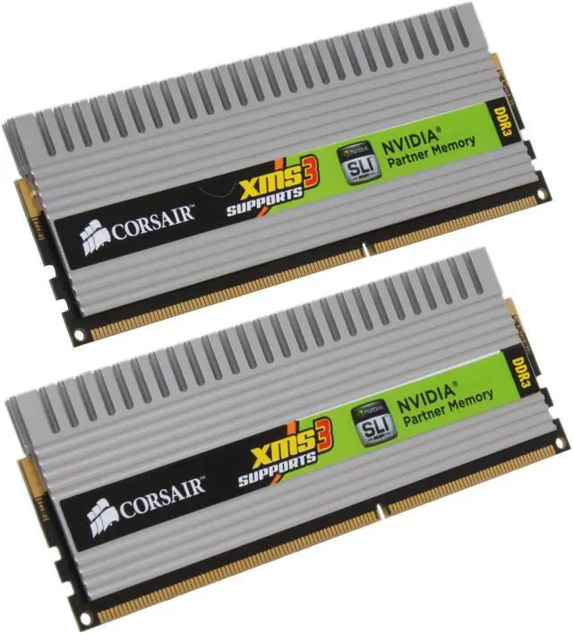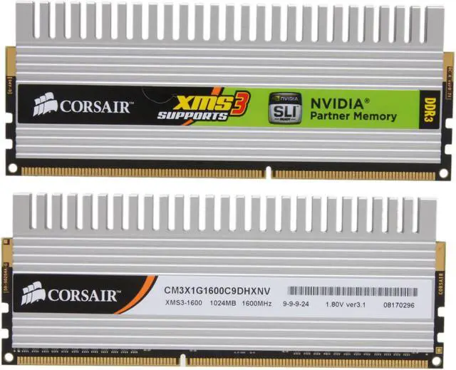 The TW3X2G1600C9DHXNV is a 2048MByte kit of DDR3 SDRAM DIMMs based upon Corsair's high performance XMS3 DHX family of memory which is certified as SLI-Ready Memory. NVIDIA EPP2.0 SLI-Ready system memory certification ensures compatibility and system stability with the rest of the SLI ecosystem components including NVIDIA nForce SLI motherboards, NVIDIA GeForce GPUs, and SLI-Ready power supplies. Specifically, when these memory modules are paired with NVIDIA nForce SLI-based motherboards, advanced performance memory settings are enabled. Built using Corsair's Dual-path Heat Xchange (DHX) technology, this part delivers outstanding performance with NVIDIA-based DDR3 motherboards and has been tested extensively to ensure compatibility and performance at its rated speed. This memory has been verified to operate at 1600MHz at latencies of 9-9-9-24 at 1.8V VDIMM.