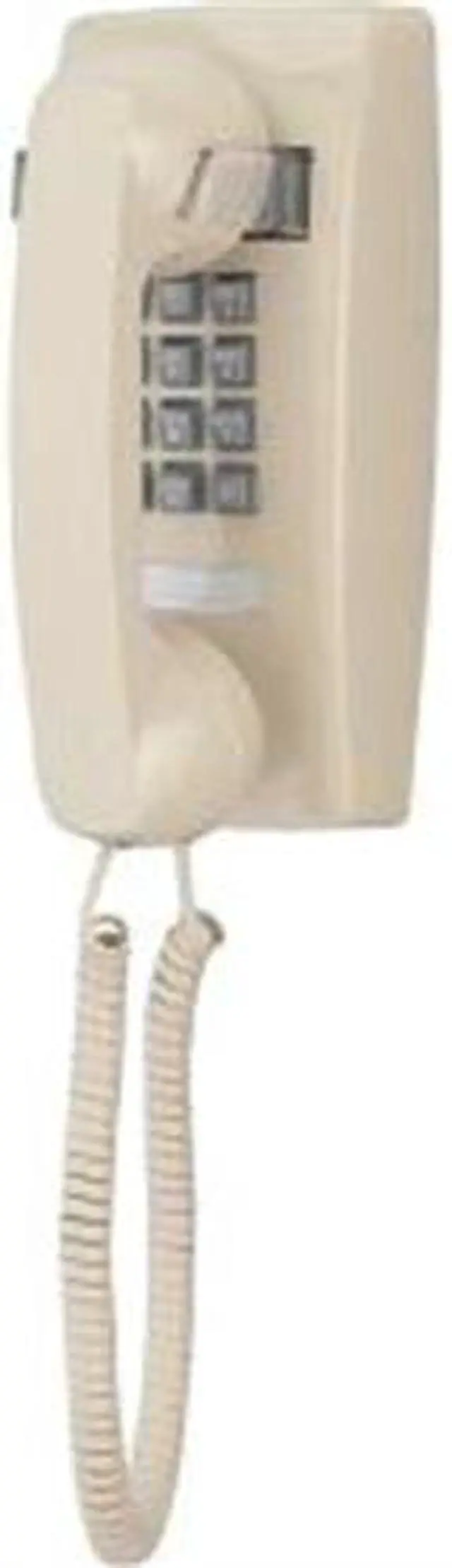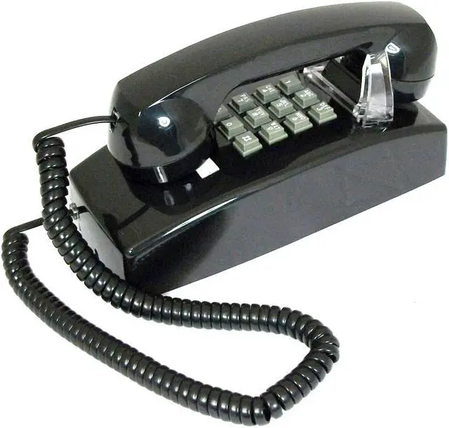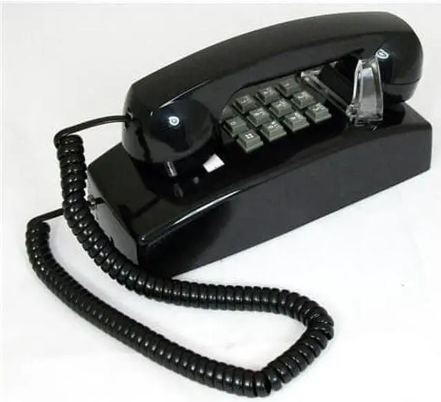 Cortelco traditional wall phone Value line Tone dial Single-gong ringer Handset volume control dial on handset Black with gray buttons Does not include flash button or message waiting light