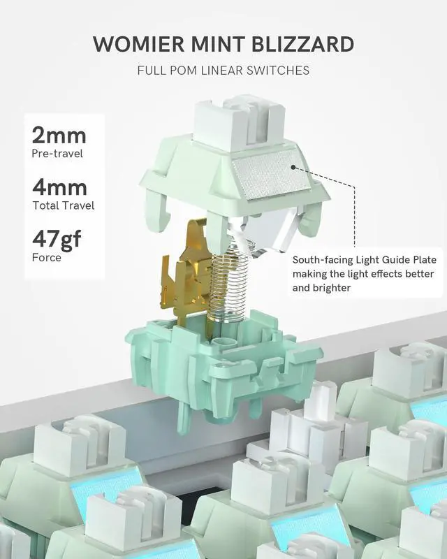 - [South-facing RGB Backlit]This rgb keyboard adds a south-facing light guide plate into each linear switch, making the light effects more well-distributed. Equipped with multiple lighting effects and customizable color and brightness settings, this backlit keyboard adds a vibrant touch to any gaming keyboard. Fn+ | is to switch different lighting effects,Fn+ ]} is to adjust the lighting color, Fn+ / is to adjust the lighting brightness, Fn+ / is to adjust the lighting speed