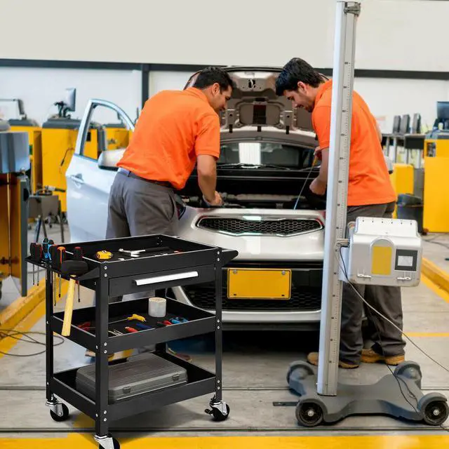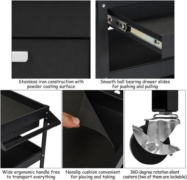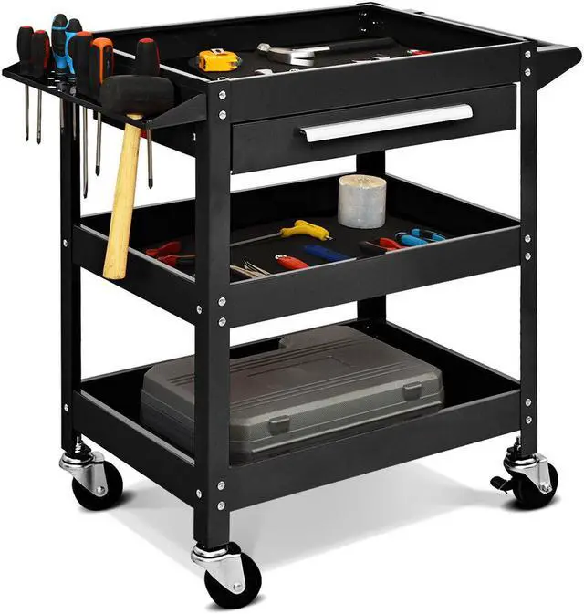 This is our new tool trolley, which is perfect for home, garage, warehouse, etc. The tool cart is made of heavy duty steel, with three spacious trays, a sliding drawer and a organizer shelf with bins for inserting small parts. Our trolley also comes with 4 casters and an ergonomic handle that bring convenience for you to move the cart. A detailed instruction will help you assemble more easily. Designed with functionality, this large three-tray tool cart make your life more convenient.Don't hesitate to buy one! Enjoy the convenience and uniformity of working time.