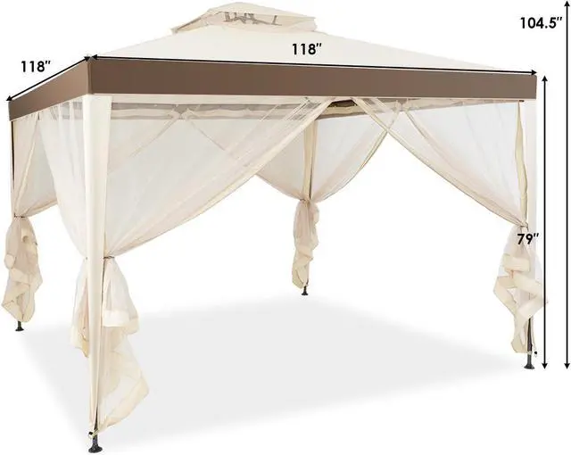 Our brand new canopy gazebo is your best choice for your yard ,you can enjoy the shade under it .it is construction of powder-coated, rust-resistant steel frame and water-proof, fade-proof with sunshine -resistant PU coated polyester fabric cover is built to last while protecting you from sun and inclement weather for years to come. Built with sloping dome design help ensure proper water drainage. The loop straps allow you to conveniently fix the curtains onto the frame of your structure. Double tier roof design expend the height of the canopy, provides proper ventilation and air flow. With 10ft length and 10ft width our gazebo tent is roomy enough for your party and relaxing in solace to entertaining guests. High quality mosquito netting with zippers, fully enclosed keeps you from disturbing of mosquito and other insect. Ideal for daily or recreational use, such as parties, outdoor events, camping, picnics and any other occasion.