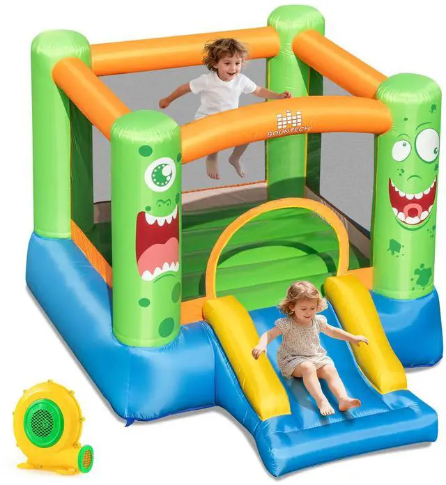 Transform your backyard or playroom into an electrifying adventure park with this monster-themed bounce house! Its more than just a bounce house; its a launchpad for endless fun and active play, boasting a spacious jump zone and a fun slide. Crafted from heavy-duty 420D oxford cloth with a resilient PVC-laminated jumping surface, this inflatable castle is built to withstand all the roughhousing your little adventurers can throw at it. It sets up in a snapjust unfold the bounce house, connect to the blower, and watch it inflate in minutes! Plus, it comes packed with all the essentials: an electric blower, stakes, a carrying bag, and a repair kit. Perfect for children aged 3-12 and safely secured with ventilated mesh walls and firm grounding stakes, this bounce house comfortably accommodates 2 kids and fits easily in both indoor and outdoor settings. Lets party with friends on this safe inflatable bounce castle!