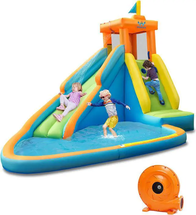 This inflatable bouncer suitable for kids from 3 - 10 years old .Its premium oxford material makes sure the inflatable bouncer is soft sturdy,safe and skin friendly. Fixed by belts and stakes and accompanied by a step and meshing net, this inflatable bouncer is stable and secure enough to take care of children. With its climbing wall, slide, splashing pool, children can enjoy various fun and stay cool while parents can have precious family time in a hot summer.