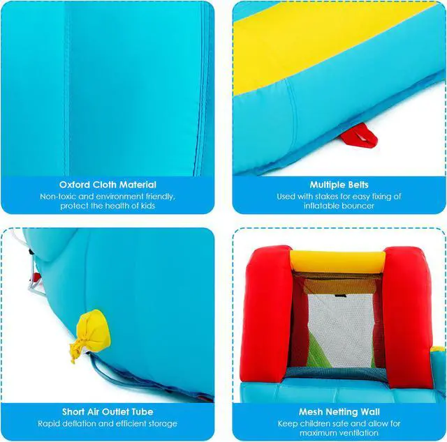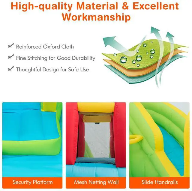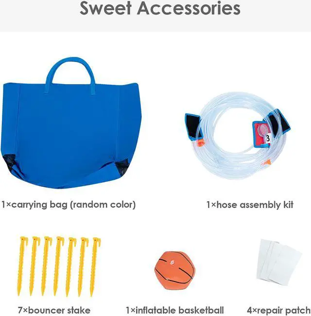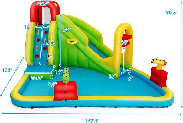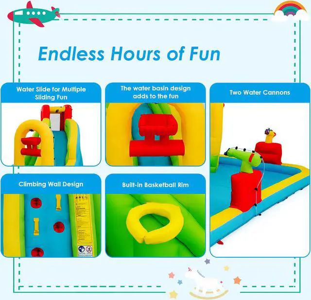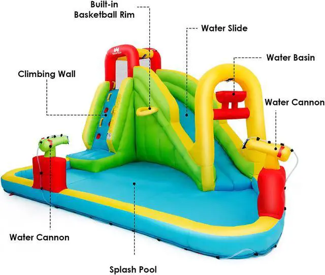 This inflatable water park is a perfect gift for children to spend leisure time. Features a slide, a splash pool, a climbing wall, a built-in basketball rim and two water cannons, children can not only enjoy multiple pleasures, but also exercise their balance. The mesh walls around the connecting area(between climbing wall and slide) ensure the children's safety while playing and satisfies the ventilation requirement well. Come with a hose, the inflatable castle can be used as a water park to make children feel cool even on the hottest summer. Made of wear-resistant oxford materials , it is sturdy enough to accompany children a long time. In addition, with a carry bag , you can take the inflatable water slide to anywhere you want and other sweet accessories also give you some help. Don't hesitate to buy one!