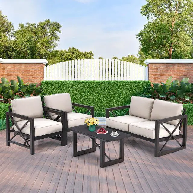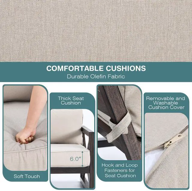 The comfy cushions must be indispensable for ultimate relaxation. Hence, thick cushions padded with soft sponge allow you to relax completely. In addition, both loveseat and coffee table are supported by premium steel construction, which is stable and sturdy. Legs are equipped with anti-slip foot pads to ensure extra stability. Just enjoy the beautiful scene with the one you loved by owning our outdoor loveseat set with coffee table.