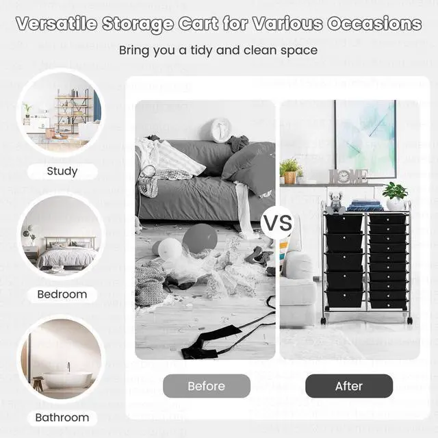 Our 15 drawer rolling storage cart includes 5 bigger drawers and 10 smaller drawers, which provide enough storage space. It is Ideal to arrange your different stuff at Office, Home, School and Garage Or Just About Anywhere Organization Is Needed. Made of Chrome Steel Framed and plastic Drawer Organizer, this 15-drawer rolling cart is durable enough to serve you for a long time. Four universal wheels will help you move it easily. Do not hesitate, to buy one!
