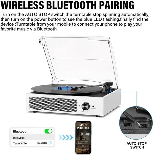 - Experience the charm of vinyl records with our versatile turntables that effortlessly handle 33 1/3, 45, and 78 RPM records. Enjoy a seamless music experience across genres and eras, while relishing the convenience of built-in speakers and Bluetooth connectivity. Upgrade your listening experience with our retro turntables that blend vintage appeal with modern functionality.