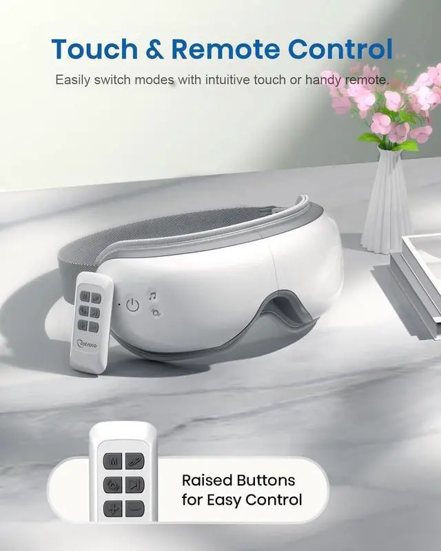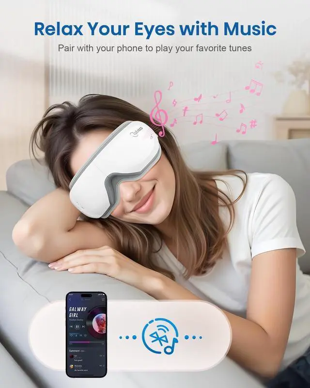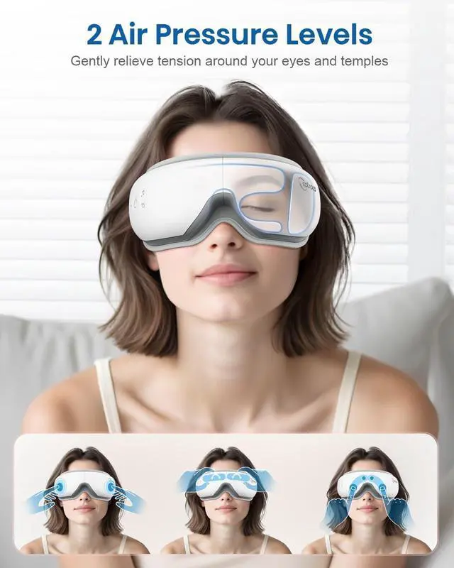 Experience the ultimate eye relaxation with our Heated Eye Massager with Remote designed to soothe tired eyes, reduce migraines, and improve sleep. Equipped with gentle heat (104°F113°F), rhythmic air pressure, and optional vibration, the massager helps relieve eye strain, dryness, puffiness, and tension headaches. Its foldable design makes it easy to pack for travel, while the ergonomic remote control allows effortless mode switching without interrupting your relaxation.Connect via Bluetooth to enjoy your favorite music or enter Silent Mode for complete peace. The 5-in-1 massage modes combine heat, compression, and music to personalize your self-care routine. It's perfect for anyone dealing with digital fatigue, long workdays, or restless nights.