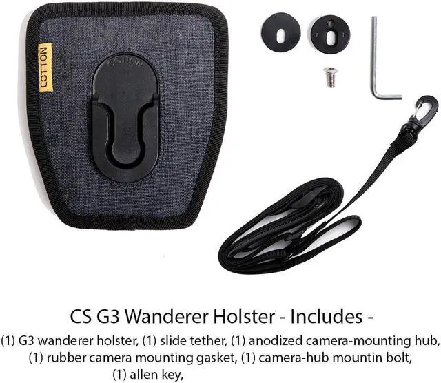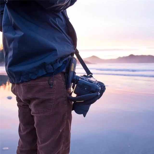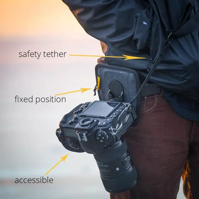 Its sturdy Velcro-Wrap system is designed to fit over your pants belt, or it can be attached to the side strap of a CCS Camera Harness or any backpack, providing versatility in carrying options. The holster features our original, flat, virtually indestructible, friction-free, hard-anodized aluminum hub. This hub is secured with a slotted hole, allowing for slight adjustments to avoid blocking the battery door. Plus, a threaded hole on the hub ensures you can still use your tripod with our system, making it a convenient choice for photographers on the go.