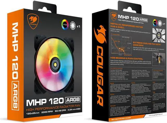 With the built-in 5V-ARGB ports and 9 ARGB lamp beads, COUGAR MHP 120 ARGB cooling fan provides various and colorful lighting effects through the fan blade that deliver a powerful and bright RGB lighting experience.