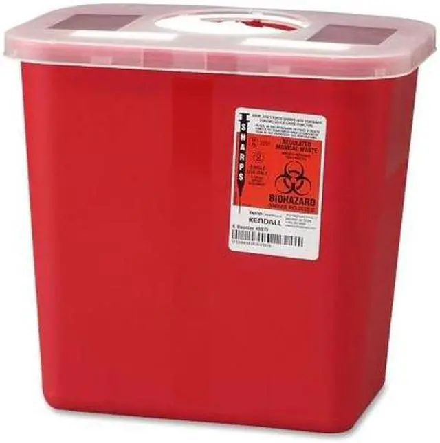 Container with rotor lid is designed to limit accidental or intentional access to used sharp items. Adjustable rotor opening accommodates a variety of Sharps sizes. Rotor lid provides temporary closure when the 2 gallon container is not in use and permanent closure for final disposal. Lid locks for final disposal. Empty container can be nested to save storage space. Plastics and pigments are safe to autoclave or incinerate.