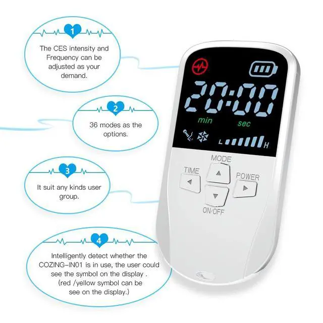 Cranial electrotherapy stimulation (CES) is a quick and safe form of neurostimulation proven to treat depression, anxiety and insomnia. CES increases serotonin levels in the brain by delivering a gentle, pulsed, alternating current via electrodes gently clipped on both earlobes for 15 minutes every day. CES is approved by EMA for over-the-counter treatment of anxiety, depression and insomnia. CES has been suggested as a possible treatment for chronic headaches, fibromyalgia and smoking cessation.