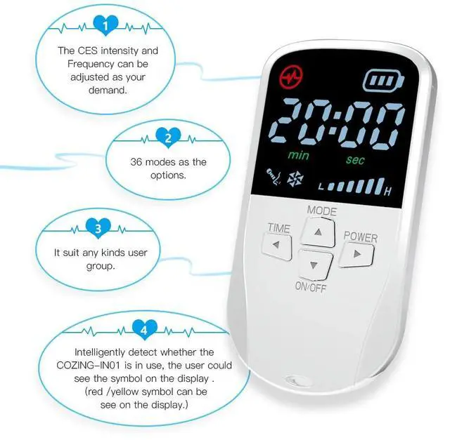 Cranial electrotherapy stimulation (CES) is a quick and safe form of neurostimulation proven to treat depression, anxiety and insomnia. CES increases serotonin levels in the brain by delivering a gentle, pulsed, alternating current via electrodes gently clipped on both earlobes for 15 minutes every day. CES is approved by EMA for over-the-counter treatment of anxiety, depression and insomnia. CES has been suggested as a possible treatment for chronic headaches, fibromyalgia and smoking cessation.
