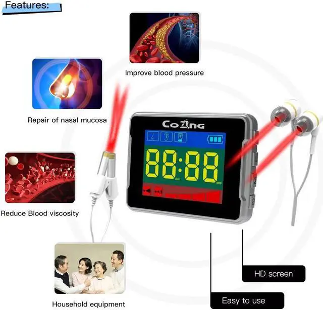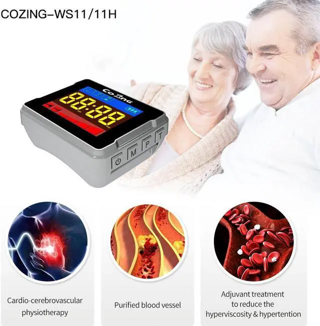 *The laser wrist watch is adopted eleven 650nm low-level laser, when cold laser watch irradiates defined acupuncture points on the wrist (radial artery, Antigenic point and nasal cavity appoint), the energy light can be absorbed by cells, to stimulates protein synthesis, help to clean blood vessel waste, improve oxygen-carrying capacity of red blood cells, accelerate blood circulation & human metabolism, reduce high blood viscosity, blood sugar, blood fat, blood pressure, repair damaged nasal mucous and cure rhinitis at the same time.