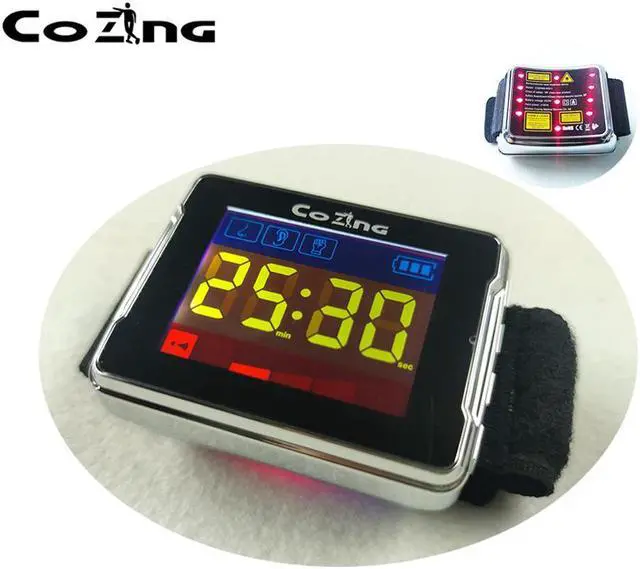 *The laser wrist watch is adopted eleven 650nm low-level laser, when cold laser watch irradiates defined acupuncture points on the wrist (radial artery, Antigenic point and nasal cavity appoint), the energy light can be absorbed by cells, to stimulates protein synthesis, help to clean blood vessel waste, improve oxygen-carrying capacity of red blood cells, accelerate blood circulation & human metabolism, reduce high blood viscosity, blood sugar, blood fat, blood pressure, repair damaged nasal mucous and cure rhinitis at the same time.