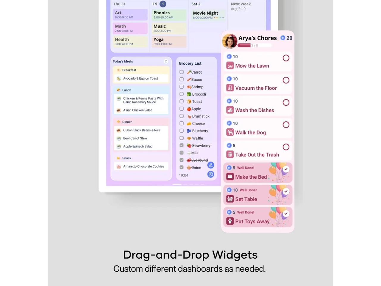 You can create multiple dashboards as needed with widgets like calendar, chore chart, meal plan, checklist, clock and weather etc. Turn Cozyla to your all-in-one family command center.