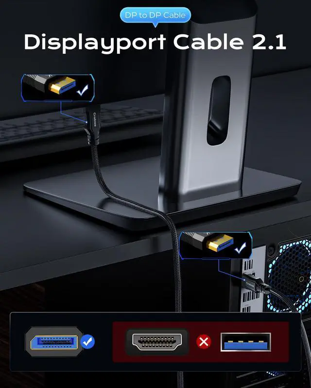 Cratree DisplayPort To DisplayPort 2.1 Cable 3 Feet.Compatible with performance graphics cards to prevent tearing and ghosting caused by rapid screen transitions during gaming, making the game more stable.Downward compatible with display ports cable 2.0/1.4/1.2