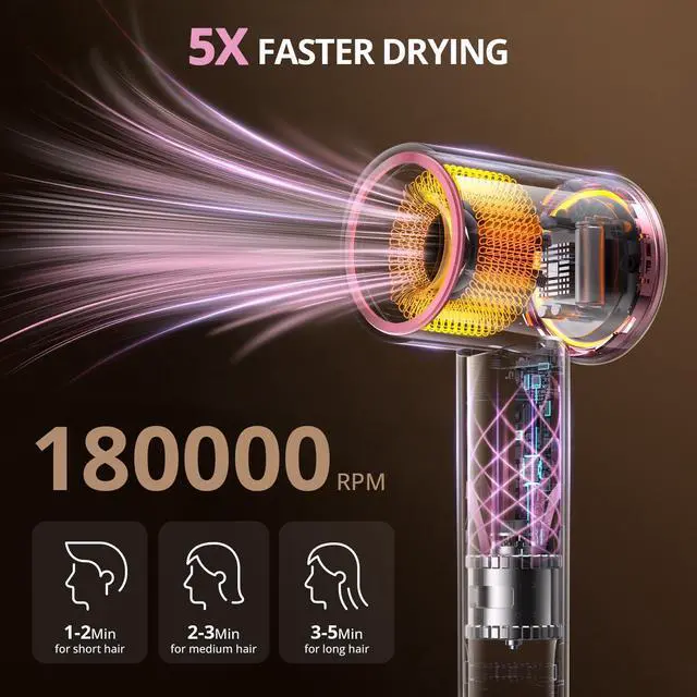2-5 Min Fast Drying: This hair dryer is equipped with a 180,000 rpm high-speed brushless motor, with a wind speed of 30 m/s, which is 5 times faster than ordinary hair dryers and dries hair in 2-5 minutes. It achieves salon-level smoothness and is suitable for busy people.