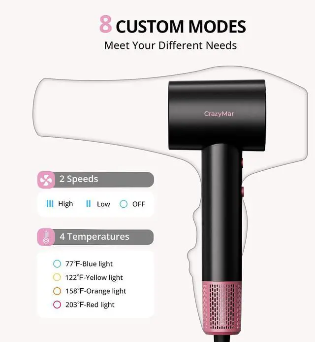 4 Temperatures: The blow dryer with diffuser has four temperature settings: cold air mode (blue light), low temperature mode (orange light), medium temperature mode (yellow light), and high temperature mode (red light). Easily switch to your favorite temperature.