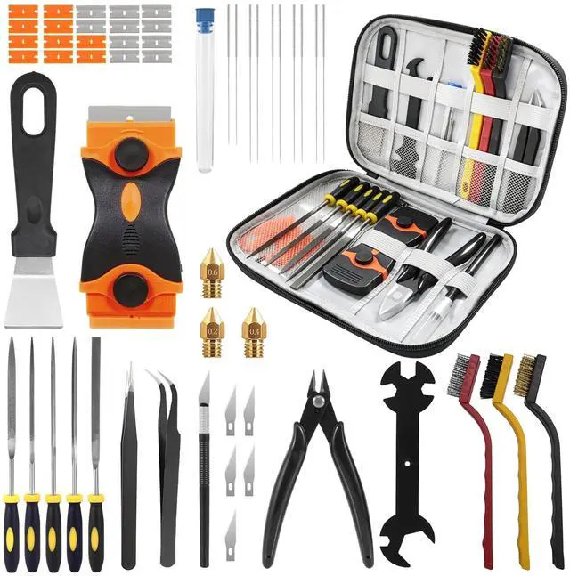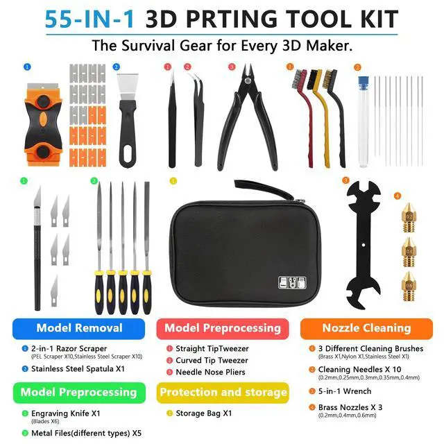 All-in-One 3D Printer Tools Kit:This 55PCS 3D printer tools kit includes essential 3D printer accessories such as nozzle cleaning needles, brass/nylon/stainless brushes, scraper, engraving knife, files, tweezers and wire cutter. A complete 3D printing tools kit for cleaning, maintenance and model finishing.