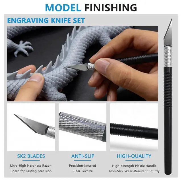 Perfect 3D Print Finishing Tools:Includes metal files, engraving knife and razor scraper designed for deburring, smoothing and removing supports. These 3D print tools help transform rough prints into clean, professional-looking models with fine details.