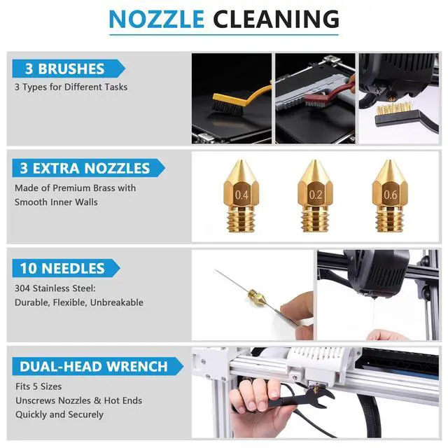 Professional 3D Printer Maintenance Kit:Keep your printer performing smoothly with precision nozzle cleaning needles and durable cleaning brushes. This 3D printer maintenance kit helps remove filament residue, clear clogged nozzles and maintain stable extrusion for consistent print quality.
