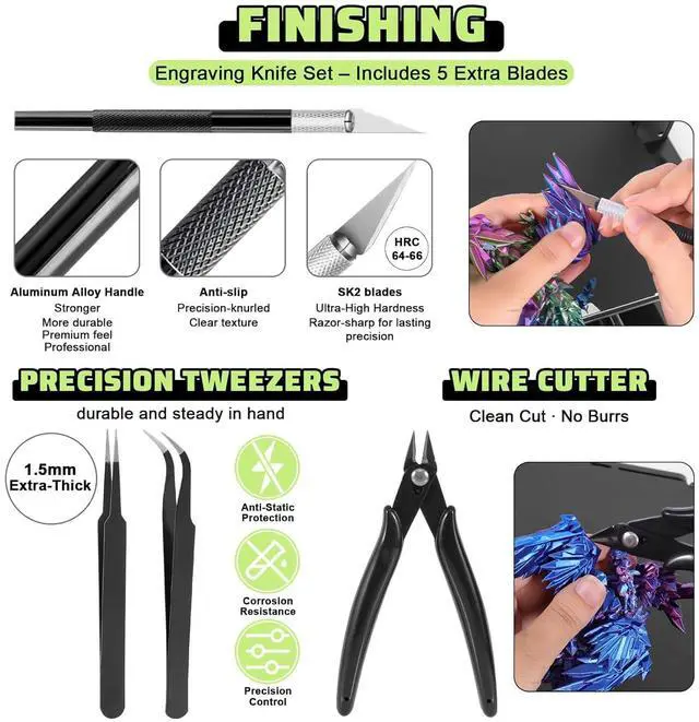 3D Printer Tools Expedite Your Workflow, 1-Year WarrantyDesigned and Selected by a 15-Year 3D print enthusiasts team, this kit includes all essential tools. We have MK8 Brass Nozzles x 2, Nozzles Cleaning Needles × 5, Brushes × 2, Small Multifunctional Wrench x 1, 45# Steel Removal Scraper x 1, Razor Spatula x 1 plus Blades x 11, Files x 5, Engraving Knife x 1 plus Blades x 6, Tweezers x 2, Wire Cutter x 1, ensuring a successful 3D model-building experience. Pro tools, better price.