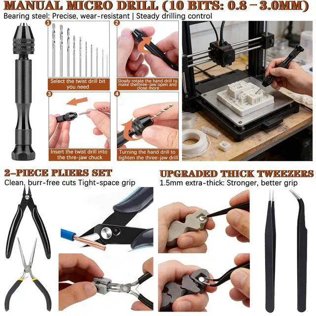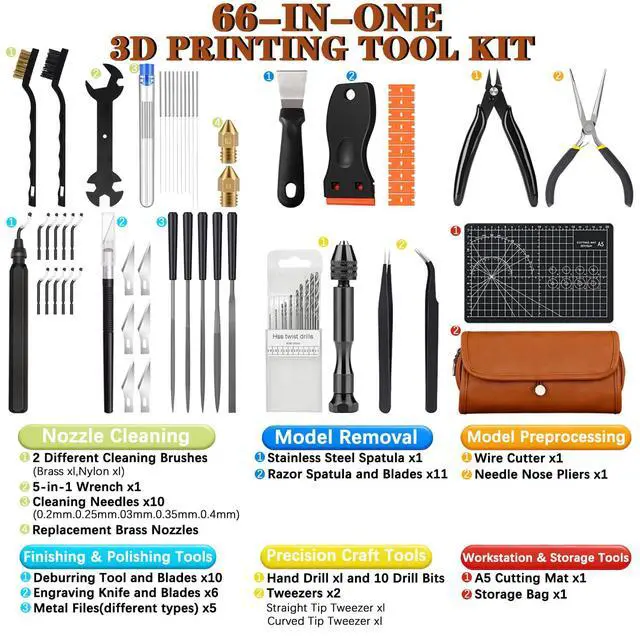 66-Piece All-in-One 3D Printer Tool Kit Complete Workshop for Perfect PrintsProfessionally curated for 3D printing enthusiasts, this comprehensive tool set includes everything you need for assembly, maintenance, and post-processing. From nozzle care to model finishing, this kit is your ultimate 3D printing tool kit and 3D printer accessories must-have. Designed for reliability and ease, its compatible with popular brands including Bambu Lab accessories and Flashforge accessories.