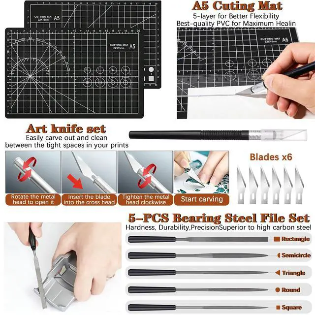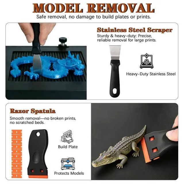 Safe Print Removal with Dual ScrapersRemove prints without damaging your build plate. The kit includes a heavy-duty steel scraper for large models and a precision razor scraper with 10 ultra-thin blades for delicate prints. Whether youre handling 3D print support removal or daily model retrieval, these tools protect your bed and extend its lifeperfect for 3D printer tools and 3D print accessories.