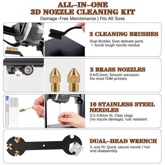Smart Nozzle Care & Maintenance StationAvoid clogs and ensure smooth extrusion with our complete 3D printer cleaning kit. The set includes 10 high-precision cleaning needles (0.2mm to 0.4mm) and 2 extra MK8 brass nozzles (0.2mm & 0.4mm). Also included are tweezers, metal and nylon brushes, and a dedicated 3D printer maintenance kit to keep your printer running like newideal for PLA, ABS, PETG, and more.