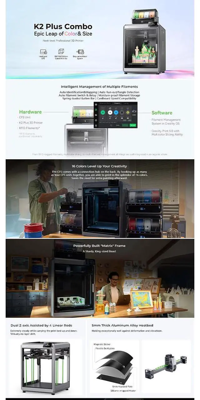 Whether youre printing large objects, multi-color models, or experimenting with advanced materials, the Creality K2 Plus Combo 3D Printer delivers professional-grade results in a user-friendly package.
