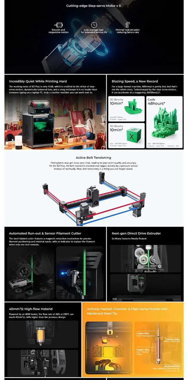 Equipped with multi-color printing capabilities, the K2 Plus can connect up to four Creality Filament Systems (CFS), allowing users to print in up to 16 colors without the need for post-print painting. Its 600mm/s print speed and 30, 000mm/s² acceleration, powered by advanced step-servo motors, significantly reduce project completion times while maintaining precision and low noise levels (45dB).