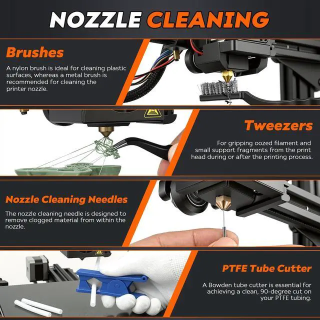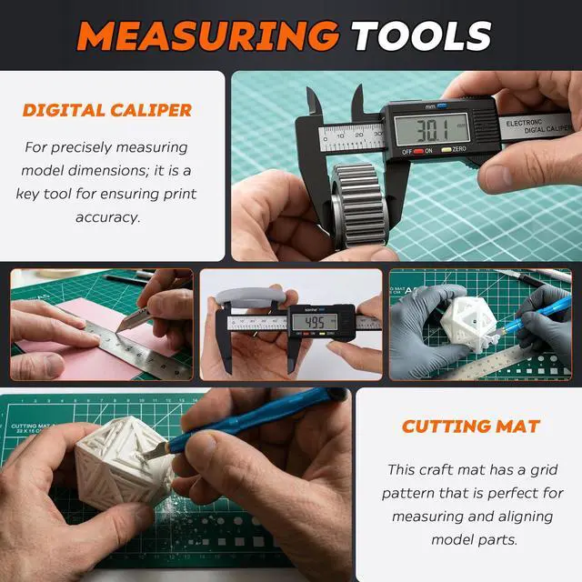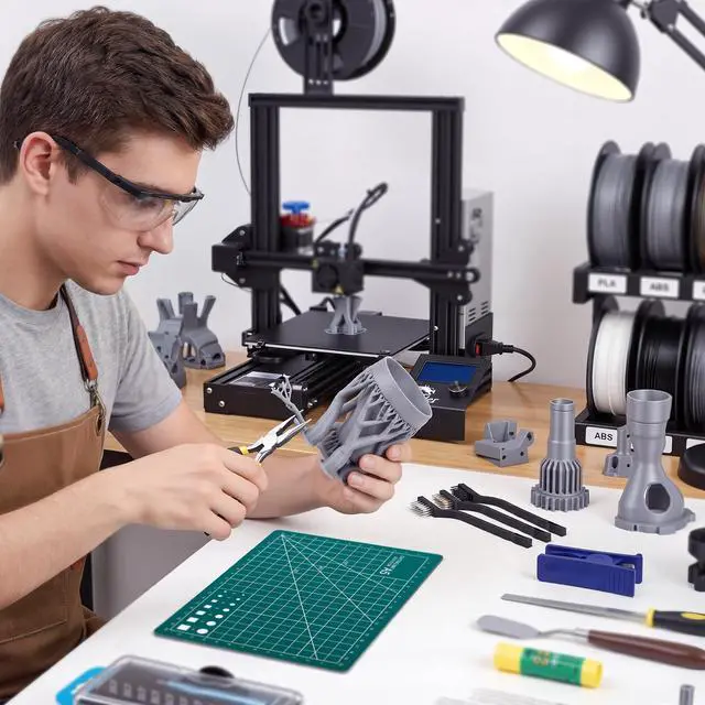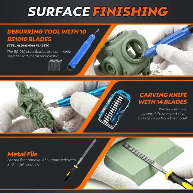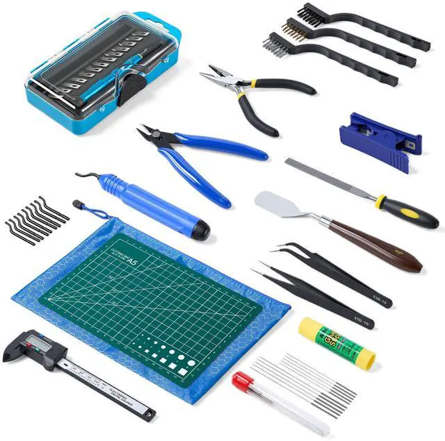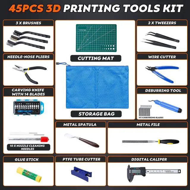45 Pieces SET: product includes 1 set of deburring tools(1 pc NB1100 deburring tool handle & 6 pcs deburring blades), Electronic Digital Caliper, 10 pcs Cleaning Needles, Art knife set(14 pcs blades and 1 pc handle), Long nose pliers, Flush cutters, 3 pcs wire brush, Nozzle cleaning kit, Tube Cutter, 2 print removal spatula, needle file, Cutting Mat, Glue stick and storage bag