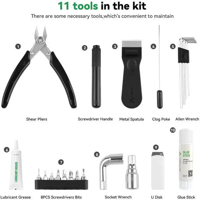 100% Creality orignial 3d printing tool kit. 11 PCS contains tools needed for 3D printing
