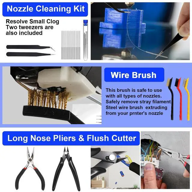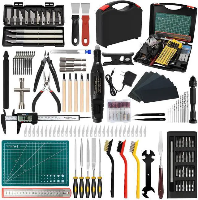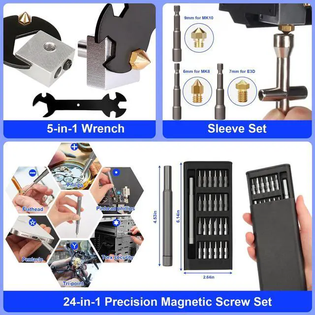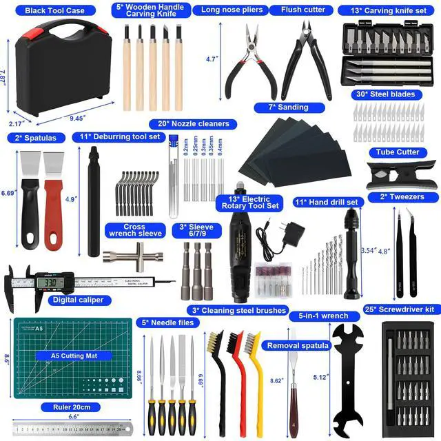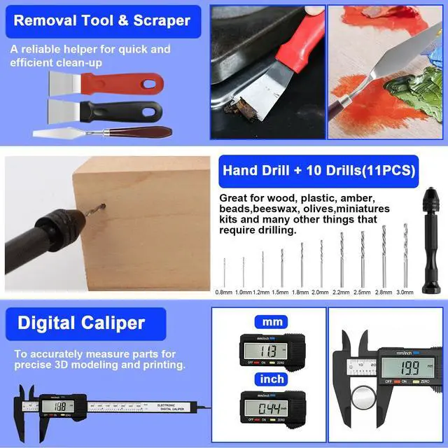 158-Piece 3D Printer Tools & Accessories Kit3D printer accessories includes: 1x electric rotary tool with 12pcs accessories, 1x deburring tool with 10 steel blades, 20* nozzle cleaners(0.2/0.25/0.3/0.35/0.4mm), 5x 3d printer cleaning kit, 5x needle files, 3x carving knife with 10pcs blades, 30x steel blades, 1x hand drill with 10pcs drill bits, 25x precision screwdriver kit, 5x wooden handle carving knife, 1x removal spatula, 1x digital caliper, and other socket wrench tools, etc. Meet all your DIY 3D printing needs