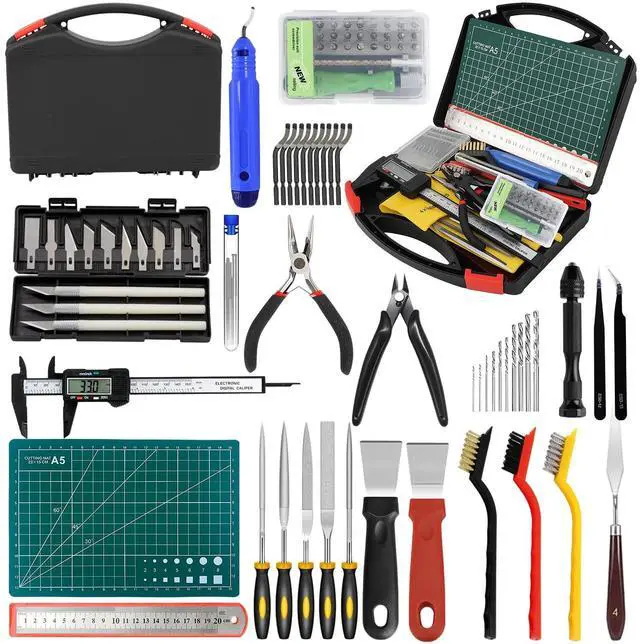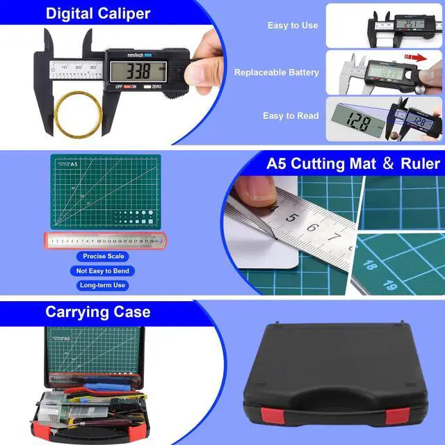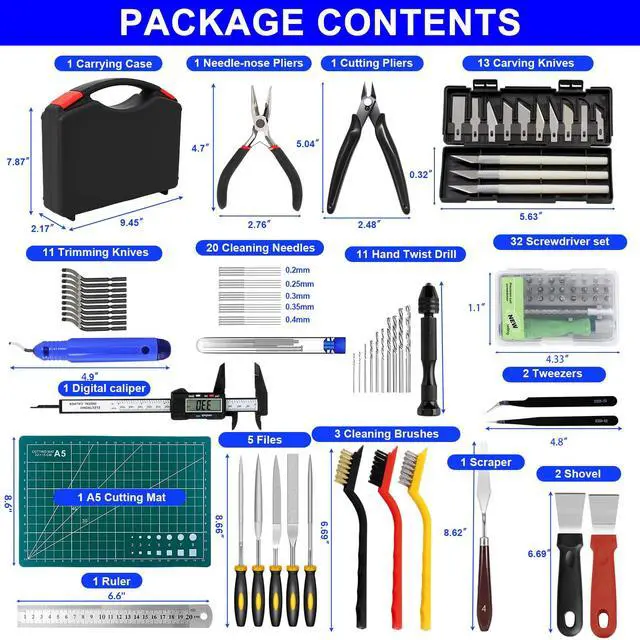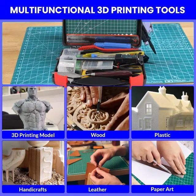 COMPREHENSIVE SET FOR ALL YOUR 3D PRINTING NEEDS From deburring tools to removal tools, each item is thoughtfully included to streamline the post-printing process. With this 3D printer tools, youll be fully equipped to tackle any task, whether its cleaning, finishing, or preparing your 3D prints for display. The inclusion of specialized tools like digital vernier caliper and a cutting mat further expands your capabilities, making it an invaluable addition to your workshop.