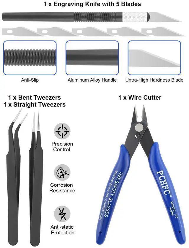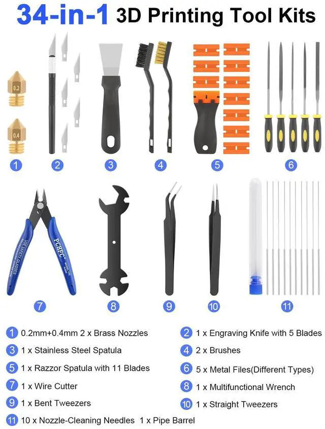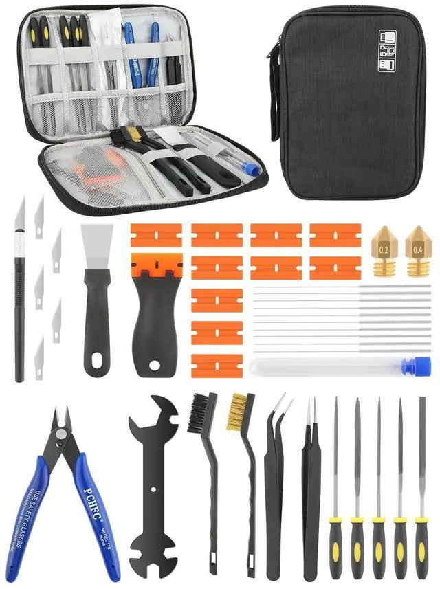 3D Printer Tool Kits Boost WorkflowEssential pro tools for smooth 3D modeling: 2 MK8 brass nozzles, 5 cleaning needles, 2 brushes, 1 multifunctional wrench, 1 steel scraper, 1 razor spatula (11 blades), 5 files, 1 engraving knife (6 blades), 2 tweezers, 1 wire cutter. Professional quality at a great price.