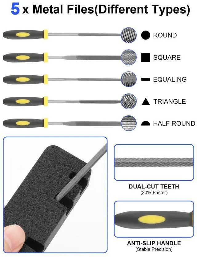 5-Shaped Metal Files for Versatile 3D Printing TasksFlat, flat warding, square, triangular, round & half-round high-hardness carbon steel files. Ideal for filing, deburring, shaping and smoothing 3D prints. Ergonomic handles ensure comfort during extended use.