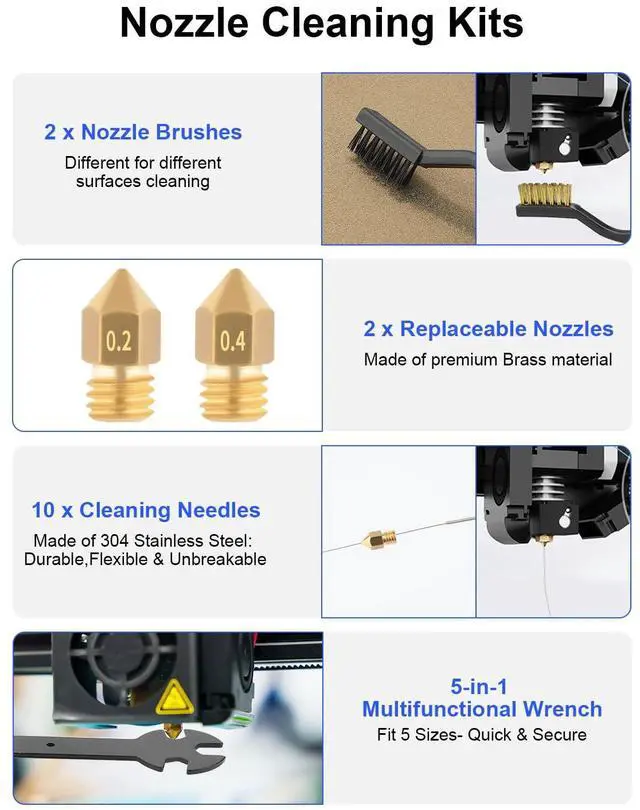 Nozzle Cleaning & Replacing One-Station SolutionPrevent clogged-nozzle-induced inconsistent filament extrusion with 5 cleaning needles (0.2/0.25/0.3/0.35/0.4mm). Plus 2 extra premium MK8 brass nozzles (0.2/0.4mm) compatible with most 1.75mm PLA/ABS 3D printers. Metal/nylon brushes and tweezers included for precise cleaning.