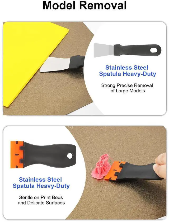 2 Removal Scrapers for Flawless PrintsSafely remove prints without damaging the bed: a heavy-duty stainless steel scraper (max leverage, fast removal for medium/large models ideal for PETG/ABS/PLA+) and a small scraper with 10 extra-thin blades (precise removal for small prints like toys).