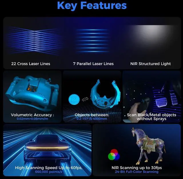 Scan at up to 660, 000 points per second and 60FPS (laser) or 30FPS (NIR) for rapid, stable resultseven outdoors or on black/metal surfaces, no spray required. Anti-shaking One-Shot 3D imaging and fast backtracking make handheld scanning smooth and reliable. The Raptor Pro is lightweight and portable at just 405g, with a robust metal lens barrel, 2.3MP imaging camera, and LED ring indicator for easy operation.