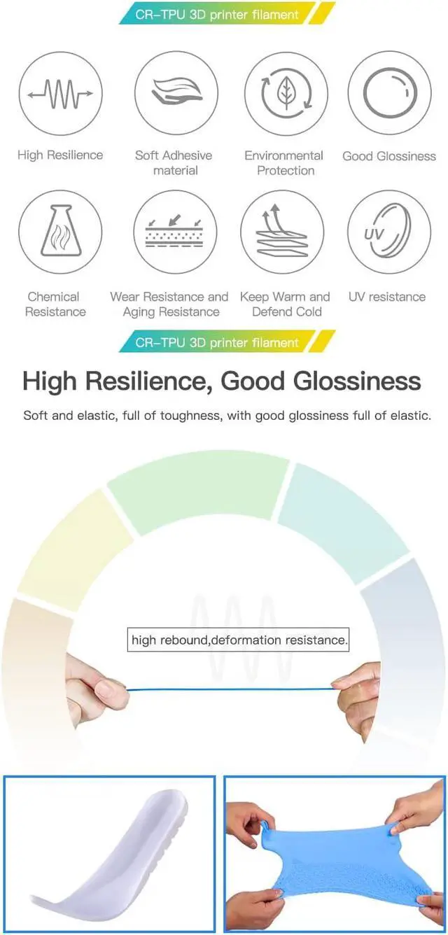 The filament is engineeBlack for high wear resistance, aging resistance, and UV resistance, ensuring your models retain their performance and appearance over time. With excellent chemical resistance to water, oil, and solvents, the Creality TPU Filament is perfect for functional parts in demanding environments.