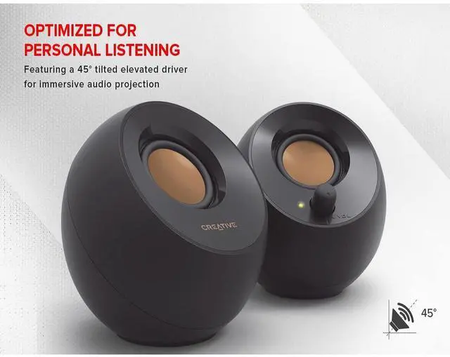 At just 4.4" wide, Pebble saves desk space and runs via USB and 3.5mm, no outlet needed.