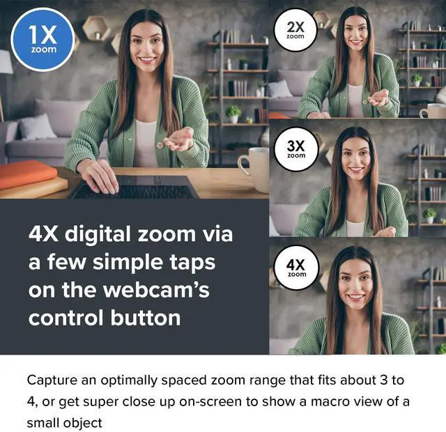 Show a lot of your background by choosing an optimally spaced zoom range that fits a group of 4 or capture only yourself with a perfectly-framed head-to-shoulder view for one-on-one calls. This webcam comes with dual omni-directional mics, and is ideal for any setups, be it for web conference, an online interview, or just catching up with loved ones.