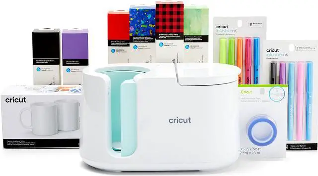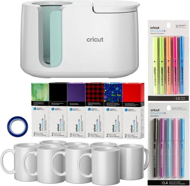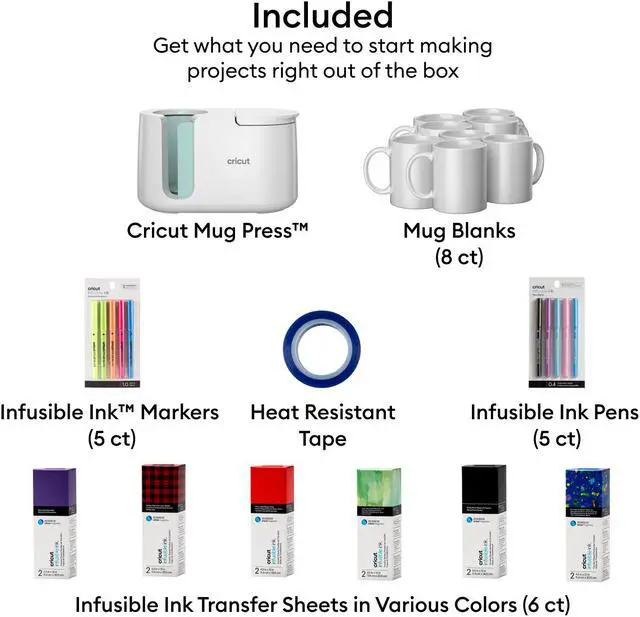 • Includes Cricut Mug Press, Ceramic Mugs Blank, White - 12 oz/340 ml, 3 Infusible Ink™ Patterns, Buffalo Check, Green Watercolor and Blue Paint Splash- 4.5" x 12", 3 Infusible Ink™, Black, Cherry Red and Ultraviolet - 4.5" x 12", Infusible Ink™ Markers (1.0), Neons (5 ct), Infusible Ink™ Pens (0.4), Watercolor Splash (5 ct) and Heat Resistant Tape.