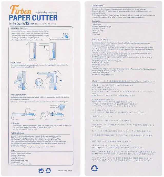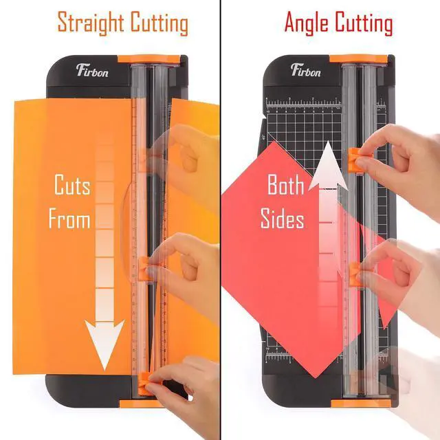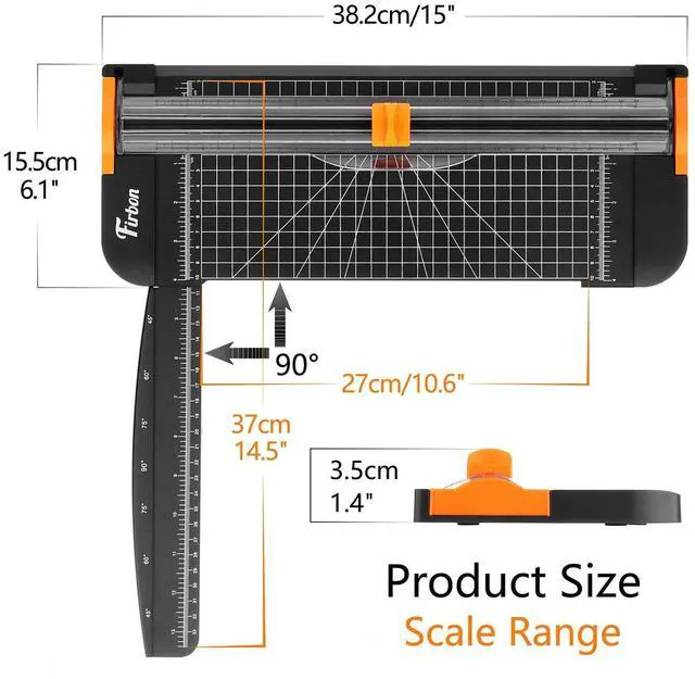 Equipped with extended ruler for easier placement of paper, angle measuring plate and cm/inch grid scale for precise cutting.