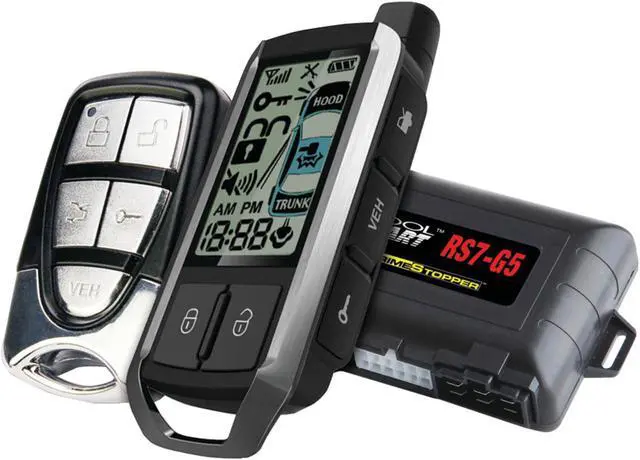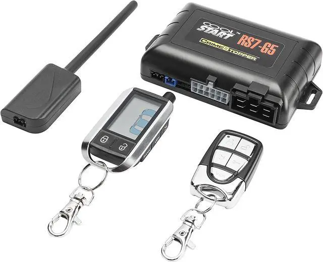 CRIMESTOPPER RS7G5 2-WAY FM FM LCD REMOTE START AND KEYLESS ENTRY SYSTEM WITH TRUNK POP2-Way Rechargeable LCD Paging Remote & Sidekick Non-Paging 1-Way Remote 3000' Operating Range 2-Way Data Port for Easy Data Module Hook-Up MobileStart (TM) Port for Easy Connection to MS-3 Module Programmable 1-Way & 2-Way Interchangeable Keyless Entry and Trunk Pop Faster Response Time On Remote For Lock Unlock and Start 4 Additional Auxiliary Outputs through Data for Sliding Door Control Turbo Timer Mode with Hand Brake Activation Programmable