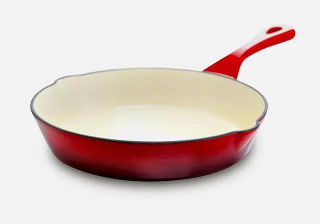 • Add a pop of color to your cookware set with this bright scarlet red cast iron pan