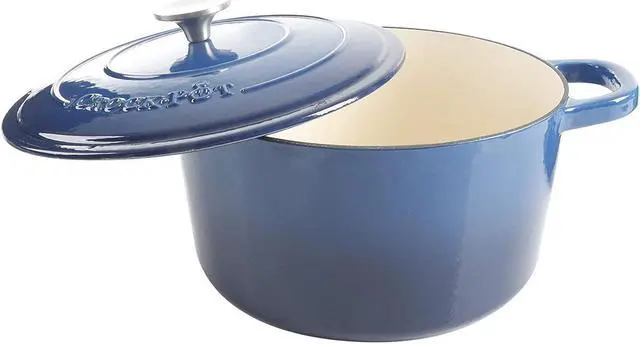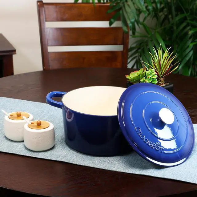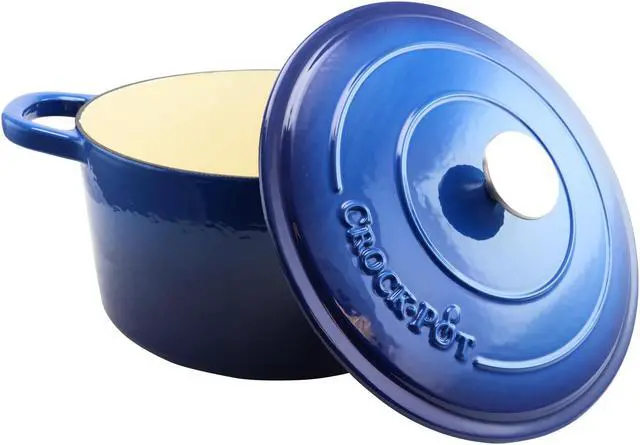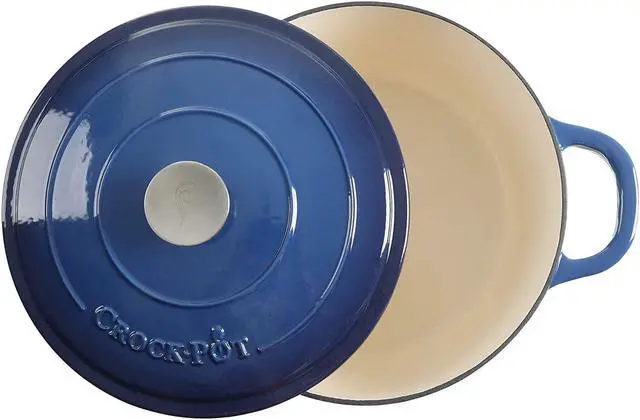 This Crock-Pot dutch oven includes a self-basting lid that creates a continuous basting environment. The cast-iron lid also has a large handle for a good grip to increase mobility. This dutch oven is long-lasting, rust-free, and is easy to clean. The heat retention of the cast iron allows you to perform many cooking techniques, including sauteing, frying, searing, braising, stewing, roasting, broiling, and baking.