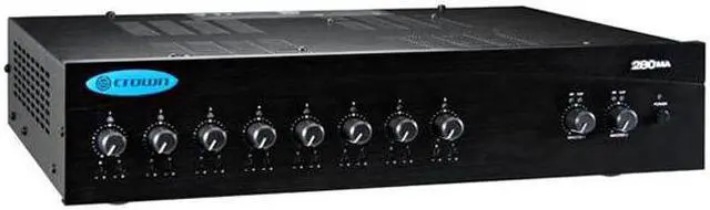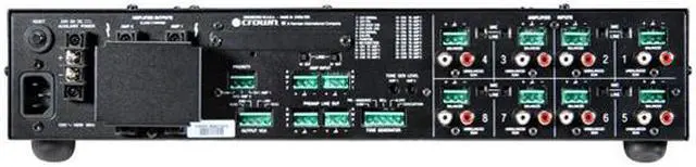 | Other Connectors | Amplifier Outputs Connectors: One per channel, 4-position terminal strip with Com, 4 ohms, 70V and 100V terminals; accepts up to 14 AWG terminal forks, non-touch cover included. Output VCA Connector: 4-pin Phoenix-type connector for two VCA control lines of +10 VDC and ground; compatible with Crown 1-VCAP and 4-VCAP modules. Priority Connector: 3-pin Phoenix-type connector shall allow Input 1 or Input 5 to mute other input signals by contact closure. Line Out Connector: One 3-pin balanced Phoenix-type connector per output channel, post master, pre-VCA, with level control. Input Connectors shall include a Mic/Line Connector of 3-pin Phoenix-type, balanced, one per input channel, and a dual RCA Input Connector for stereo music signals, unbalanced, summed together, two connectors per input channel. |